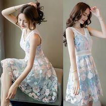 Vネック ノースリーブ レースAラインワンピース 膝丈